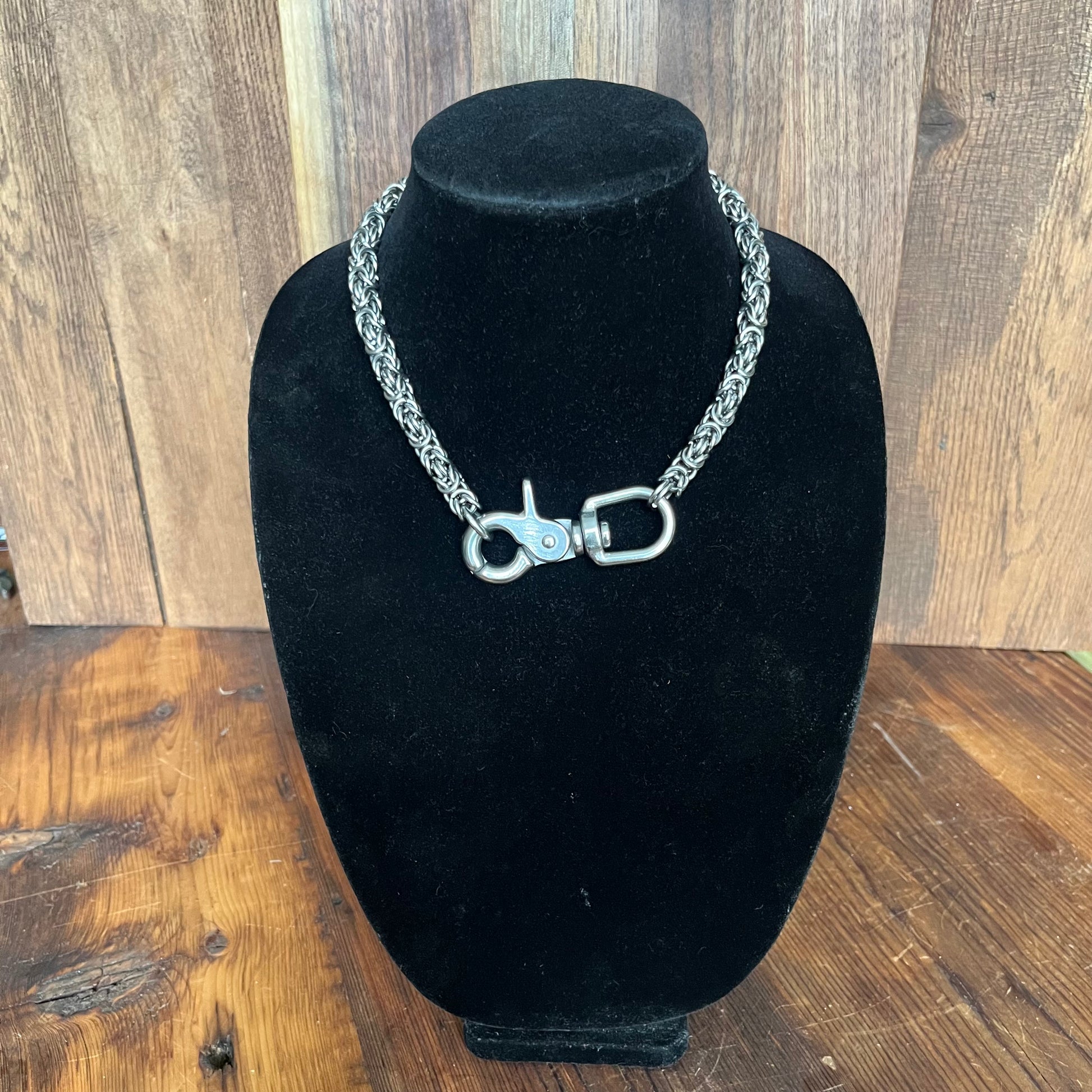 Byzantine chain with a big ole stainless steel swivel snap closure. Length options include the length of swivel snap.